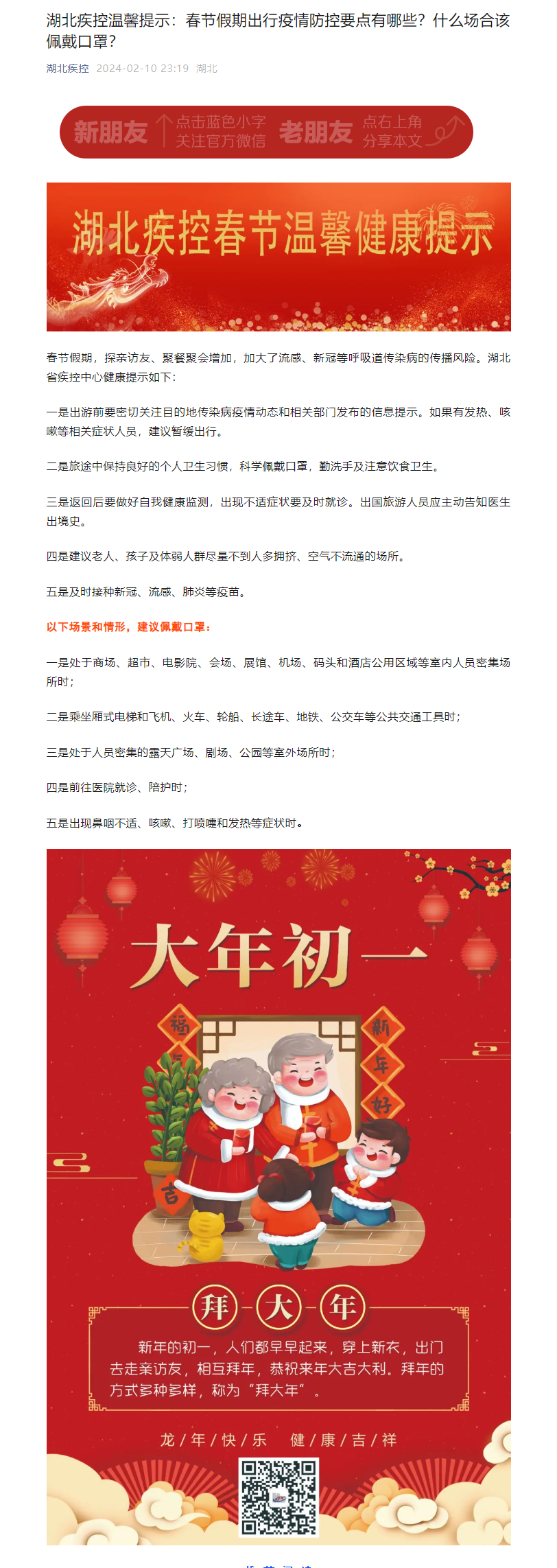 湖北疾控溫馨提示:春節假期出行疫情防控要點有哪些?什么場合該佩戴口罩?