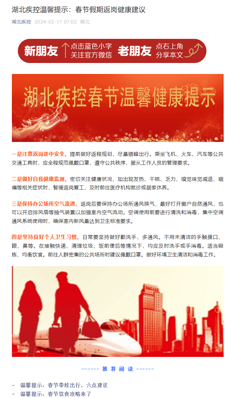 湖北疾控溫馨提示:春節假期返崗健康建議