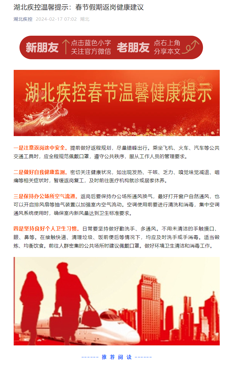 湖北疾控溫馨提示:春節假期返崗健康建議