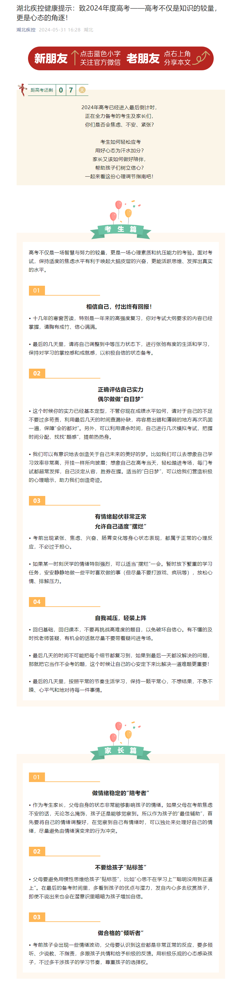 湖北疾控健康提示:致2024年度高考——高考不僅是知識的較量,更是心態的角逐!