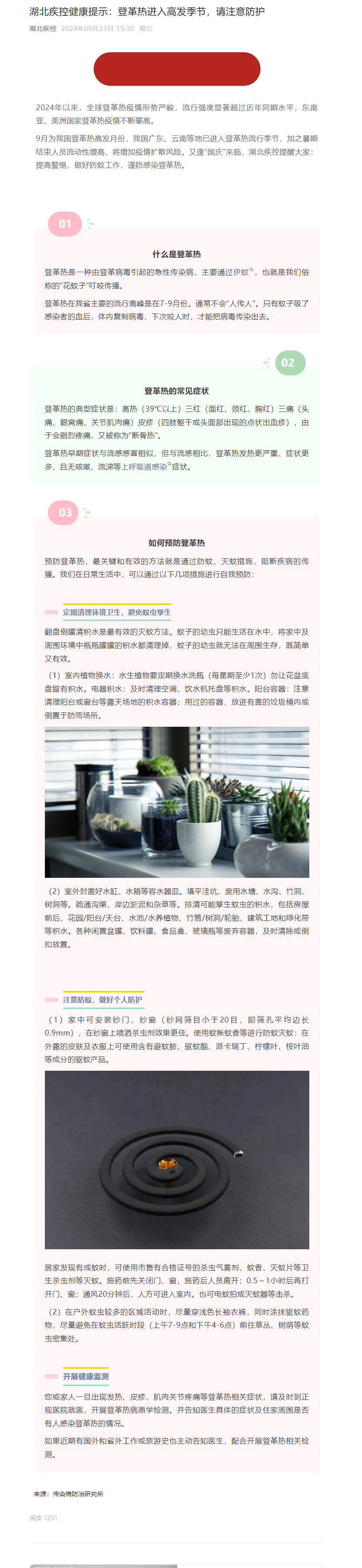 湖北疾控健康提示:登革熱進入高發(fā)季節(jié),請注意防護