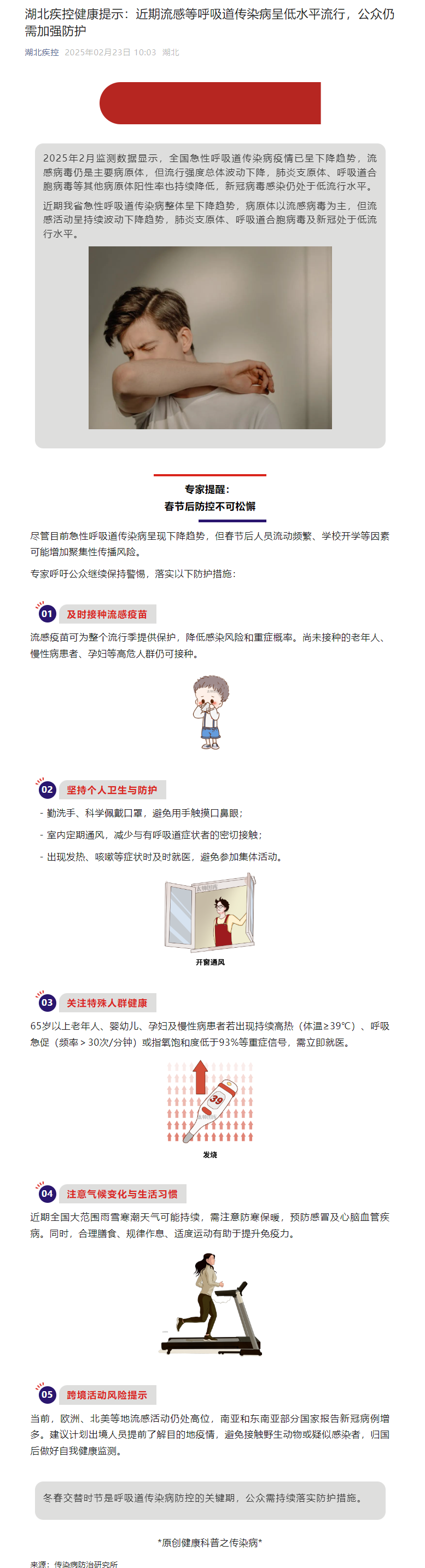 湖北疾控健康提示:近期流感等呼吸道傳染病呈低水平流行,公眾仍需加強防護