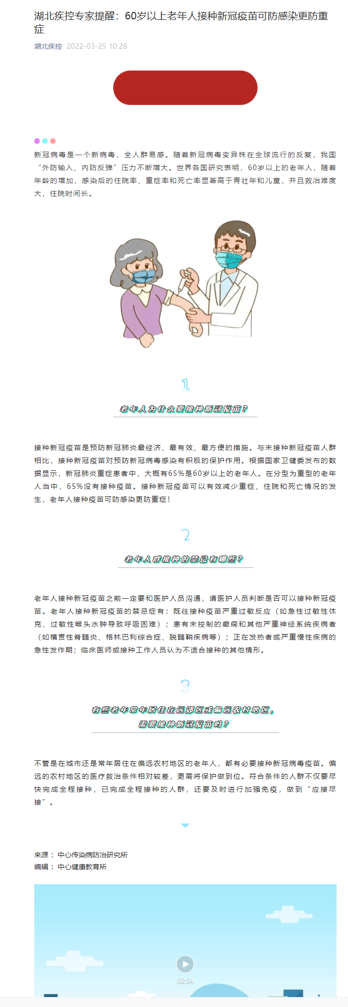 湖北疾控專家提醒:60歲以上老年人接種新冠疫苗可防感染更防重癥