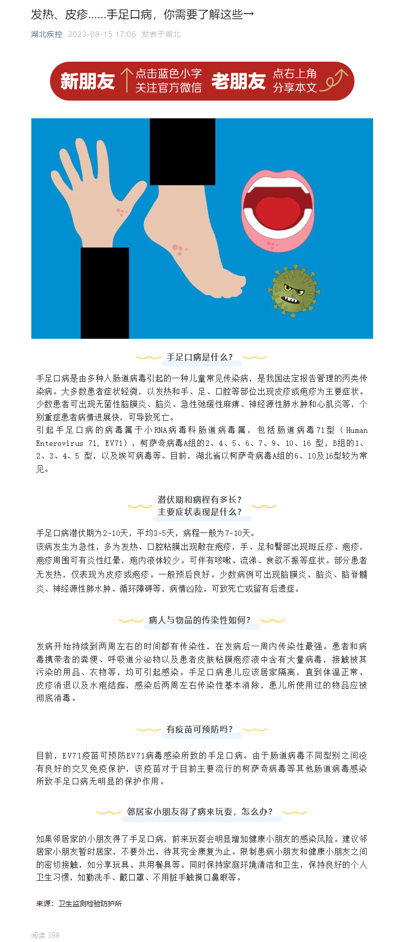 時(shí)間:2023-08-16 08:38:34來源:湖北省疾病預(yù)防控制中心  點(diǎn)擊量: