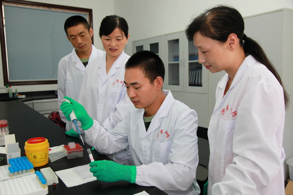 圖為武警衛(wèi)生員正在老師的指導(dǎo)下進(jìn)行血吸蟲病血清學(xué)檢測(cè)。