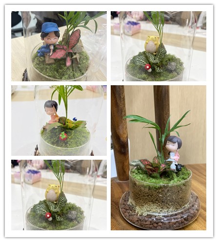 活動開始前,微景觀制作師首先介紹了制作所需的材料和制作技巧等知識,大家聽得聚精會神、躍躍欲試。簡單教學后,大家開始動手制作,依次把火山石、水苔、赤玉土、苔蘚、小擺件放入圓形玻璃瓶中。待種好綠植、將土壓實、鋪上苔蘚和松皮石,最后插上一個可愛的小擺件做裝飾,一件小小的“森林世界”就組成了。制作完成后,大家紛紛表示意猶未盡、回味無窮。