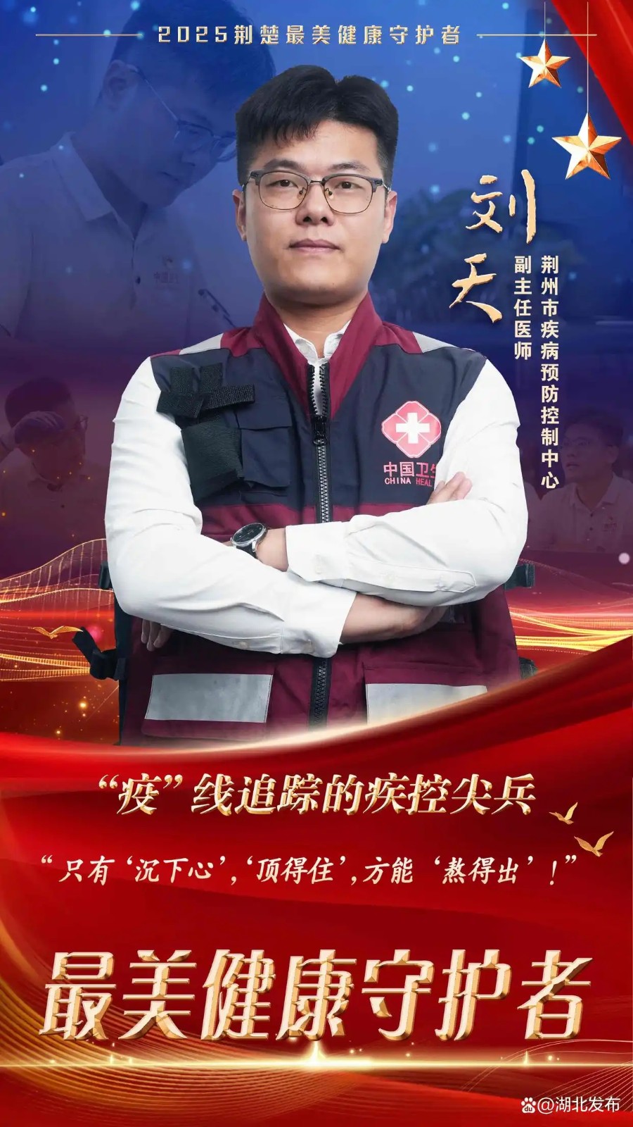 8月14日晚,由湖北省衛生健康委員會主辦的《以生命的名義——2025“荊楚最美健康守護者”》致敬禮在武漢舉辦。現場,10位“最美健康守護者”名單揭曉。來自荊州市疾病預防控制中心的劉天作為全省疾控系統唯一一名公衛醫師和荊州市唯一一名醫師代表閃亮登場,并獲得2025“荊楚最美健康守護者”的榮譽稱號。