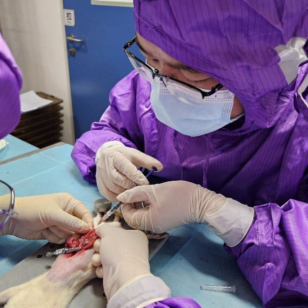 該模型的制作需要進(jìn)行開放性手術(shù)。首先打開腹腔暴露胃腸,在九曲腸袢中找到胰膽管,從十二指腸腸腔穿刺經(jīng)十二指腸乳頭逆行進(jìn)入胰膽管,緩慢注射牛黃膽酸鈉,引起胰腺彌漫性炎癥。如果手術(shù)創(chuàng)口大,注射點(diǎn)摸不準(zhǔn)或者造模劑給予的量和速度控制不好,動(dòng)物術(shù)中術(shù)后均易引起死亡。安評(píng)中心和湖北省中醫(yī)院的同志們在不斷地演練中,操作技術(shù)越來越熟練,細(xì)節(jié)上也不斷的優(yōu)化,最后達(dá)到了腹壁開口僅為2cm,注射點(diǎn)精準(zhǔn)無創(chuàng)傷,術(shù)后無出血感染的近乎微創(chuàng)手術(shù)的水準(zhǔn)。在正式的主試驗(yàn)中,10人組成流水線,平均2分鐘可完成1只動(dòng)物的造模,24小時(shí)后的病理學(xué)檢查也動(dòng)物胰腺100%出現(xiàn)了彌漫性的水腫、出血、炎性細(xì)胞浸潤、壞死等炎性表現(xiàn)。該手術(shù)方式的成功將急性重癥胰腺炎的大鼠造模技術(shù)往前推進(jìn)了一大步。