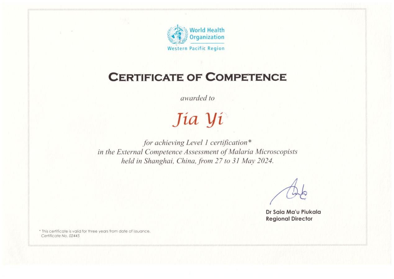 2024年5月27日-31日,世界衛生組織(WHO)在上海對中國瘧疾鏡檢專家進行的能力評估認證。血吸蟲病防治研究所的易佳同志作為中國選派的12名鏡檢專家之一,進行了為期5天的考核評估,并以優異成績榮獲WHO瘧疾鏡檢能力一級水平認可,取得WHO瘧疾鏡檢能力一級最高資質資格。一級水平證書在全球范圍內認可通用,目前我省是首次獲得一級水平證書。