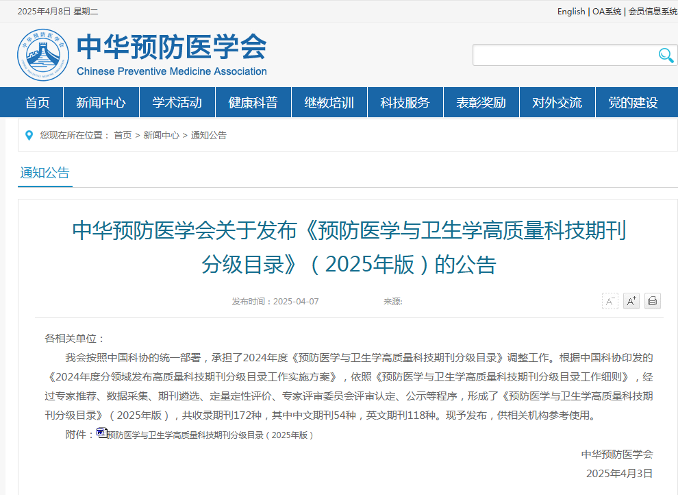 2025年4月7日,中華預(yù)防醫(yī)學(xué)會(huì)官網(wǎng)發(fā)布了《預(yù)防醫(yī)學(xué)與衛(wèi)生學(xué)高質(zhì)量科技期刊分級(jí)目錄》(2025年版),我刊《公共衛(wèi)生與預(yù)防醫(yī)學(xué)》首次入選《預(yù)防醫(yī)學(xué)與衛(wèi)生學(xué)高質(zhì)量科技期刊分級(jí)目錄》。